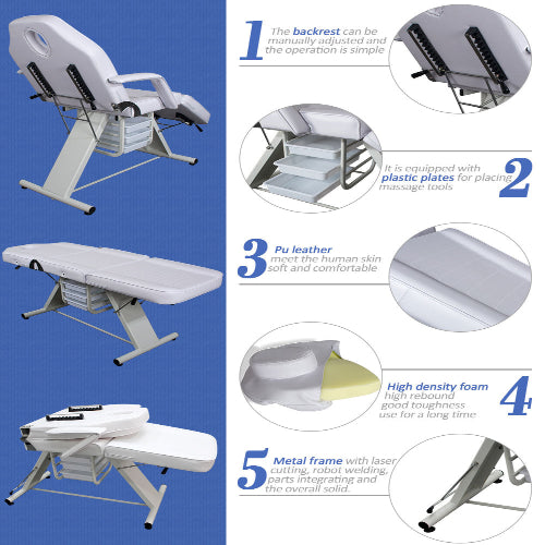 The DP-8337 can be tilt adjusted by hand, and it is equipped with plastic plates for placing massage tools, which is more convenient for the massage operation. The wide iron frame provide enhanced stability on any type of floor.